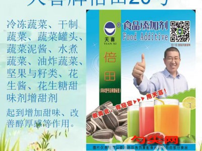 ★商品名:天喜牌倍田20型 产品名称:倍田牌复配甜味剂20 型号:BT-20 本品按照《食品安全国家标准 食品添加剂使用标准GB2760》及补充规定的品种、应用分类、使用范围、最大使用量、残留量等科学组方,并且按照《食品安全国家标准 复配食品添加剂通则GB26687》精心配制而成。本品已经通过食品生产许可,保障食品安全。用户按照本说明的用法用量生产制作的加工蔬菜 (食品分类号:04.02.02.03 腌渍的蔬菜除外)(食品分类号:04.02.02)、加工坚果与籽类(食品分类号:04.05.02)、坚果与籽类的泥(酱),包括 花生酱等(食品分类号:04.05.02.04)、除胶基糖果以外的其他糖果(食品分类号:05.02.02)、谷类和淀粉类甜品(如米布丁、木薯布丁)(食品分类号:06.09)、果蔬汁(浆)类饮料(食品分类号:14.02.03)、植物蛋白饮料(食品分类号:14.03.02)、复合蛋白饮料(食品分类号:14.03.03)、碳酸饮料(食品分类号:14.04)、茶、咖啡、植物(类)饮料(食品分类号:14.05)、特殊用途饮料(食品分类号:14.07)、风味饮料(食品分类号:14.08)、发酵酒(食品分类号:15.03.01葡萄酒除外)(食品分类号:15.03)、膨化食品(食品分类号:16.06)。既不会超标也不会超量。