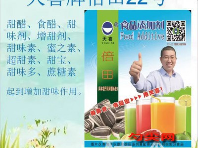 ★商品名:天喜牌倍田22型 产品名称:倍田牌复配甜味剂22 型号:BT-22 本品按照《食品安全国家标准 食品添加剂使用标准GB2760》及补充规定的品种、应用分类、使用范围、最大使用量、残留量等科学组方,并且按照《食品安全国家标准 复配食品添加剂通则GB26687》精心配制而成。本品已经通过食品生产许可,保障食品安全。用户按照本说明的用法用量生产制作的食醋(食品分类号:12.03)既不会超标也不会超量。
